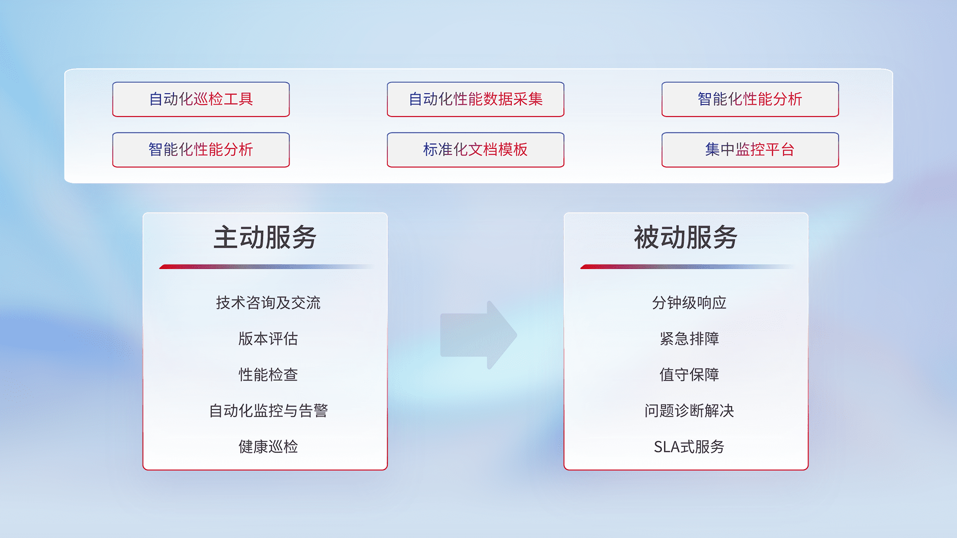 智能化工具和标准化文档,,保障服务质量,,提供主动服务(包含技术咨询、、版本评估、、、、性能检查、、、自动化监控与告警、、、、健康巡检)和被动服务包含(分钟级响应、、、、紧急排障、、值守保障、、问题诊断解决、、SLA服务)。。